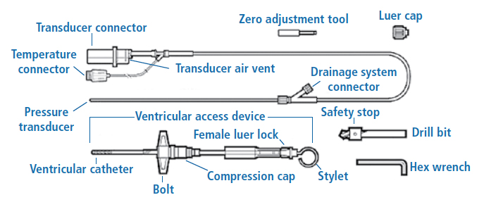 | Catéter ventricular con perno – Diámetro externo – Diámetro interno – Longitud |