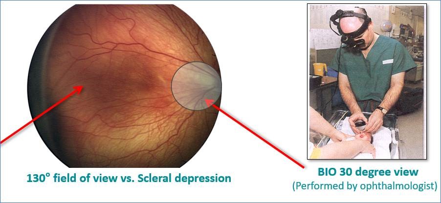 Dans de nombreux établissements, l’ophtalmoscopie indirecte binoculaire (BIO) est la technique de dépistage de la RDP par défaut. , C’est un ophtalmologue qui la réalise. On dilate les pupilles pour améliorer le champ de vision, on utilise un spéculum de paupière (image 4) pour empêcher l’œil du nourrisson de se fermer involontairement et une dépression sclérale pour examiner la rétine de profil si nécessaire9.