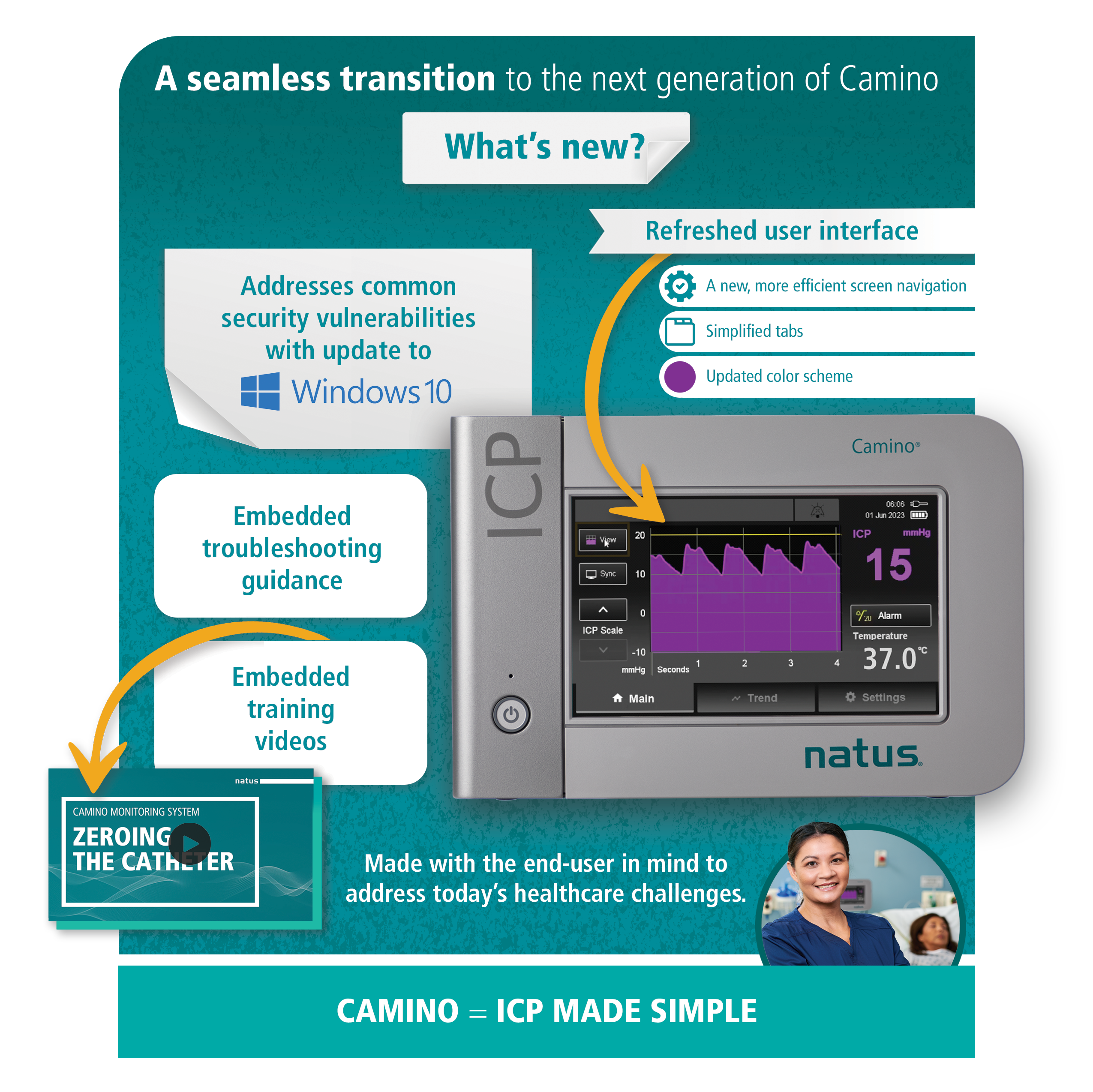 Now more than ever, in a healthcare environment where staffing is short and tenure is limited, monitoring ICP should be simple. The new generation of the Camino® Intracranial Pressure and Temperature Monitor offers rapid ICP assessment while easing stress for clinicians during critical moments.