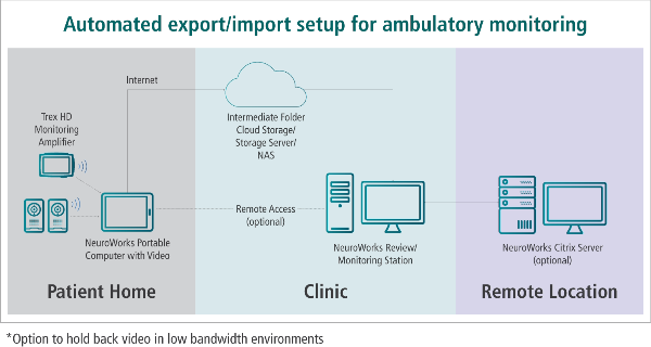 Provide wireless home video EEG monitoring and review with simultaneous data transfer to a local storage server for further reviewing and sharing. Begin the study with a few simple clicks without the need for patient interaction up to 72 hours. The two-camera system provides patients additional freedom of movement at home without the need to carry equipment from room to room.