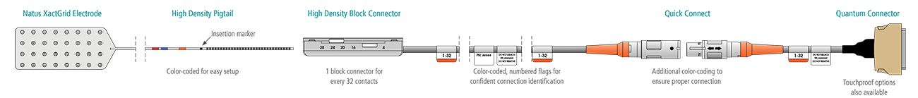 Natus XactTrode™ Subdural Electrodes are the most efficient electrode and cable management system on the market. Simplify cable management with one block connector required for every thirty-two (32) contacts. A smarter design means fewer patient cables to connect, providing a more efficient workflow while maximizing the quality of the recordings. This system is designed to integrate seamlessly with the Natus Quantum® LTM Amplifier, making set up ideal for functional brain mapping while simultaneously providing patient comfort.